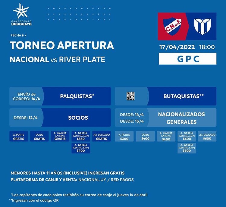 La operativa de canje/venta de entradas para socios y transferencia de butacas se desarrollará únicamente a través de nuestra plataforma web nacional.uy Como ya es costumbre en este año los menores de hasta 11 años inclusive tiene acceso gratis acompañados de un mayor, no teniendo derecho a butaca. De ser socios y menores de 11 pueden realizarSigue leyendo «NACIONAL RECIBE AL DARSENERO»